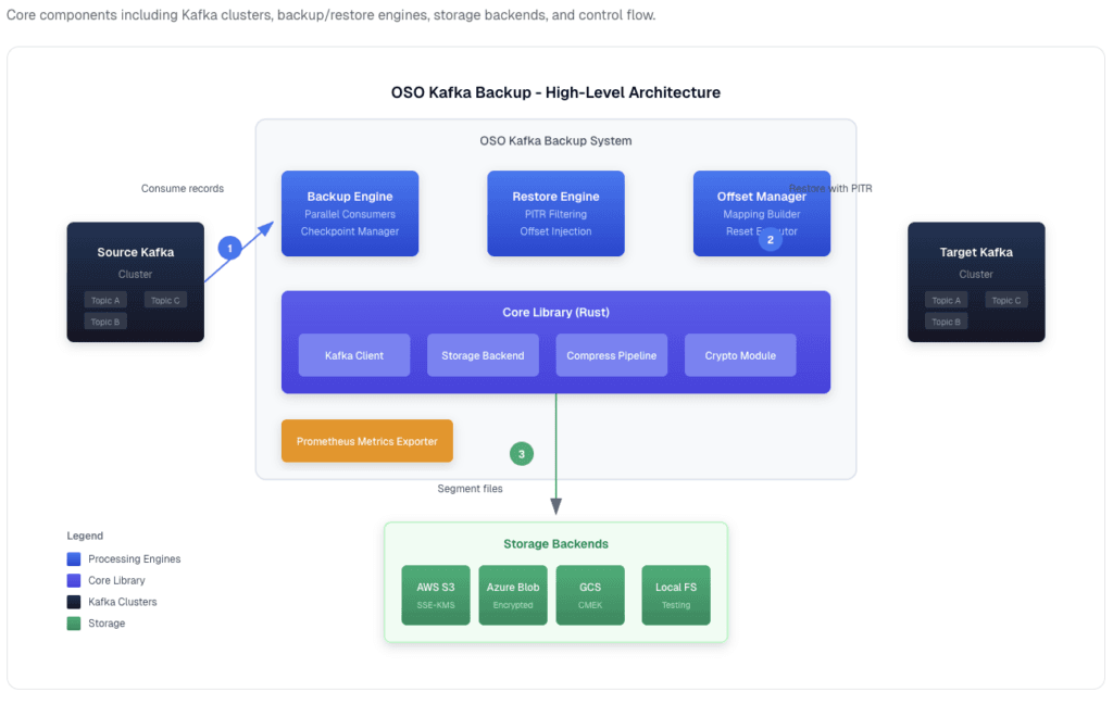 This guide walks through how to implement genuine Kafka backup with point-in-time recovery using OSO’s open-source kafka-backup tool, a high-performance CLI written in Rust that supports S3, Azure Blob, GCS, and local filesystem storage.