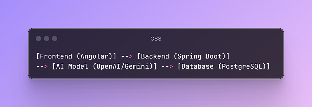 [Frontend (Angular)] → [Backend (Spring Boot)] → [AI Model (OpenAI/Gemini)] → [Database (PostgreSQL)]